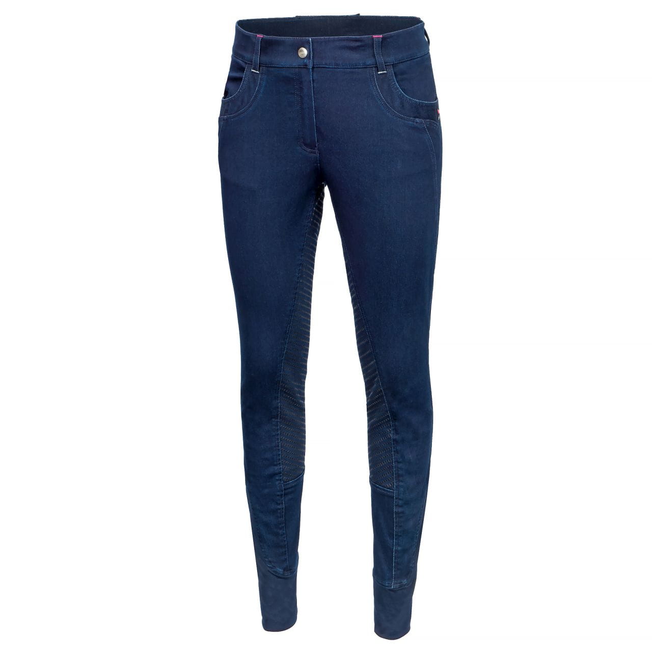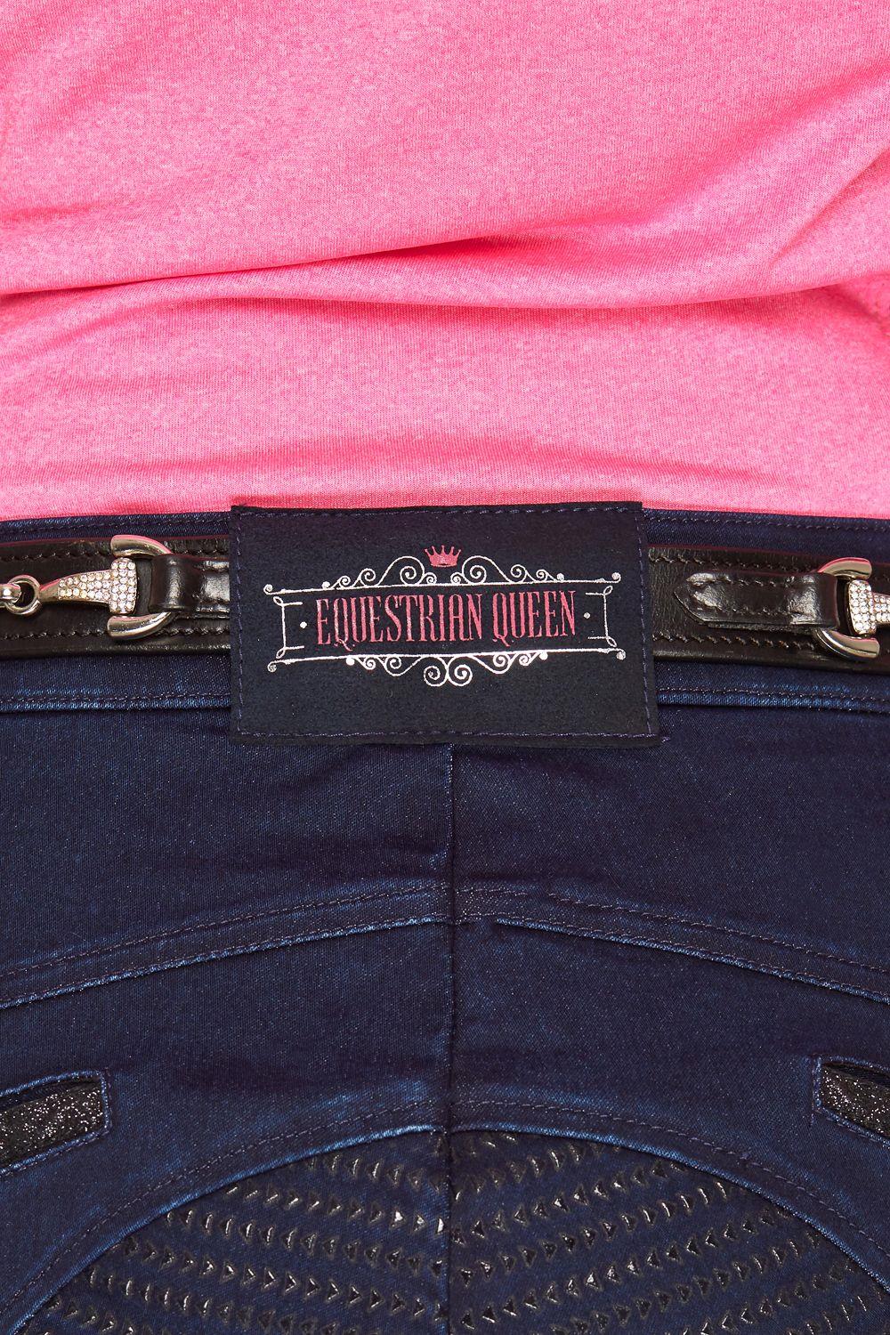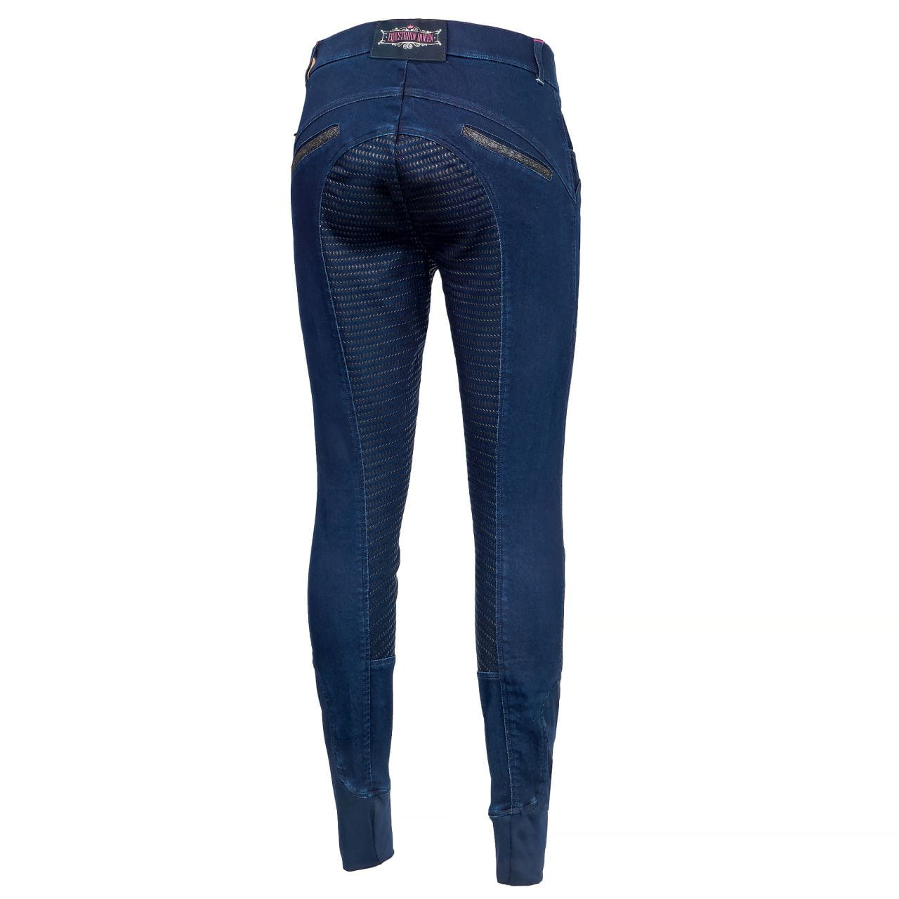 Bryczesy z pełnym lejem silikonowym wykonane z materiału jeansowego. Lekkie, łatwe w czyszczeniu, świetnie się dopasowują. Zdobione printem i wstawkami glitter na kieszeniach.
