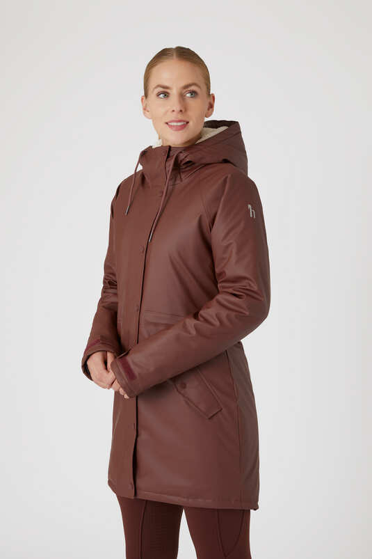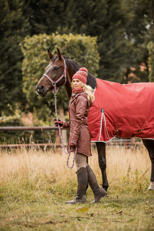 Model Horze Dania jest uszyty z nieprzemakalnego materiału, który skutecznie ochroni Cię przed deszczem, i wykończony puszystą, miękką w dotyku podszewką.