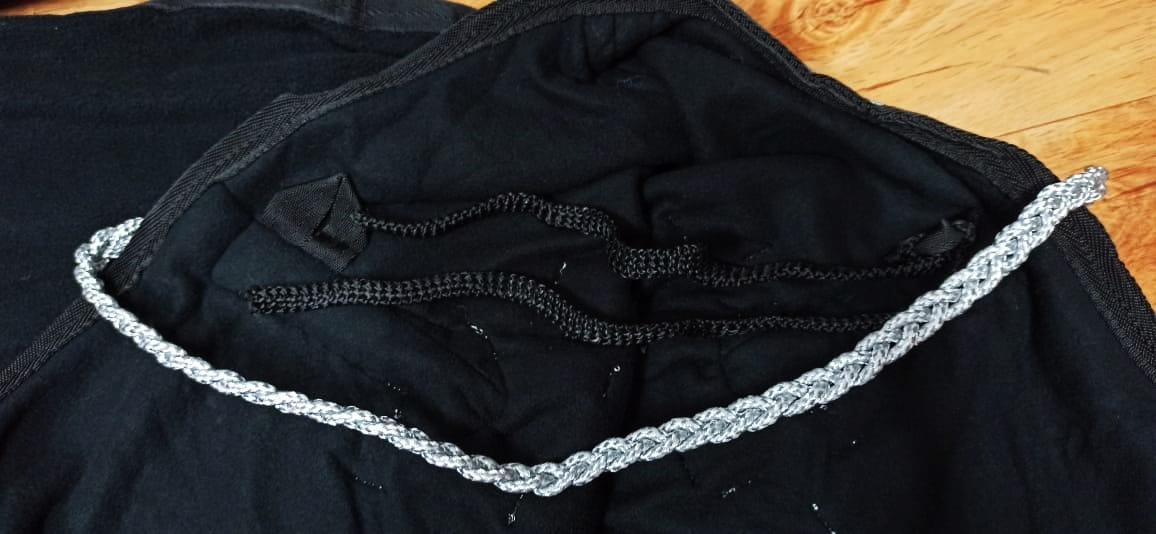- Ozdobiona srebrnym sznurkiem oraz plecionym sznurem pod ogon