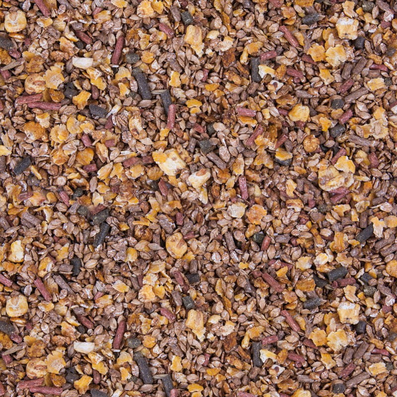 płatki kukurydziane, ekspandowane płatki jęczmienne, ekspandowane płatki pszenne, susz z lucerny, otręby pszenne, ekspandowana kukurydza, melasa, jęczmień, drożdże piwne, węglan wapnia, węglan sodu, fosforan jednowapniowy, olej lniany