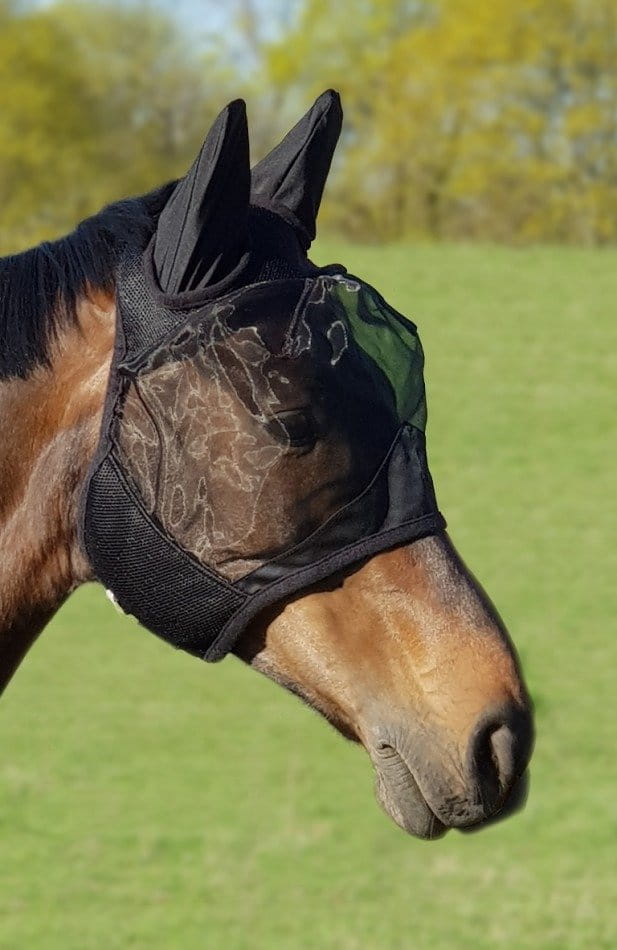 Maska chroniąca oczy i uszy konia przed uciążliwymi owadami. Jej przewiewny materiał pozwala skórze oddychać nawet w upalne dni.