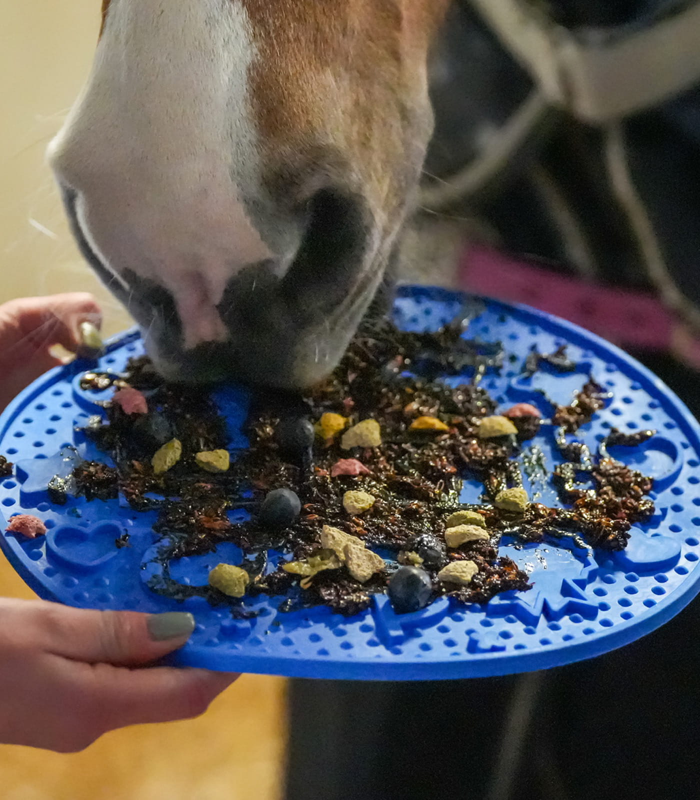 Posmaruj pastą lub puree Likit Graze i posyp dowolną karmę lub smakołyk, który lubi Twój koń. Możliwości różnych przepisów są nieograniczone.