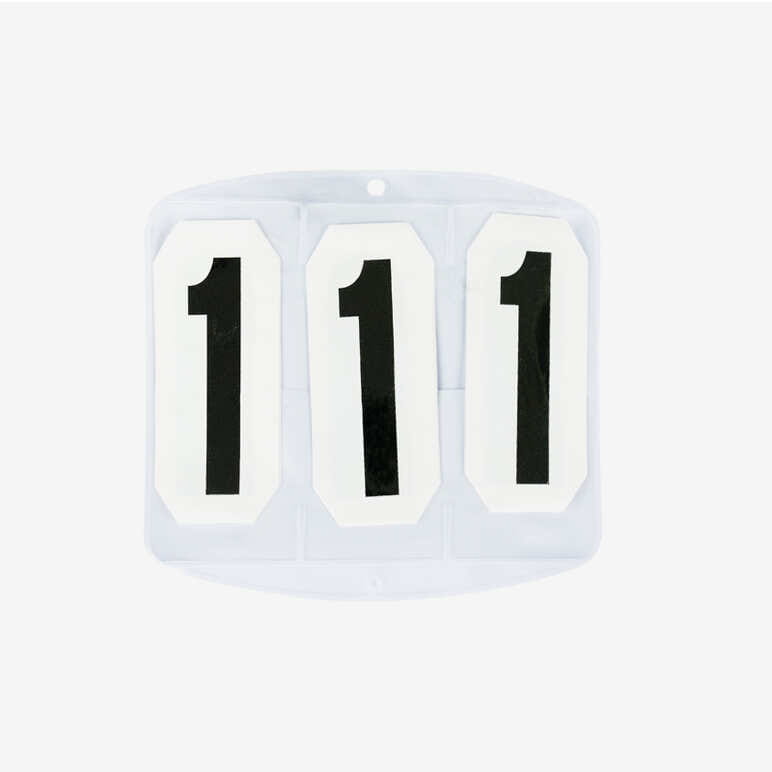 Dobrze widoczna, biała plakietka z PCV z numerem startowym to niezbędny element podczas zawodów. Plakietka posiada miejsce na trzy cyfry, od 0 do 9. Miejsca te pokryte są przezroczystym tworzywem w celu ochrony przed deszczem i wiatrem, a jednocześnie zapewniającym widoczność numeru startowego. Plakietkę można łatwo przypiąć do paska policzkowego lub napierśnika.