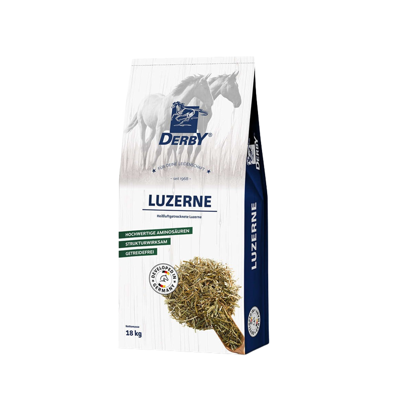 DERBY LUZERNE zawiera delikatnie suszoną, lekko melasowaną lucernę i zielony owies. Jest łatwo przyswajalna i wysoce strawna. W połączeniu z niską zawartością pyłu jest idealna dla koni alergików. Wysokiej jakości białko pochodzące z DERBY LUZERNE szczególnie nadaje się jako substytut siana dla klaczy hodowlanych i dorastających źrebiąt, ale także dla koni sportowych i rekreacyjnych. DERBY LUZERNE zawiera ważne aminokwasy egzogenne i stanowi ważny dodatek do pasz treściwych ze względu na swoje pozytywne właściwości w fazie budowy mięśni u koni wyczynowych. Uzupełnienie skoncentrowanej dawki pokarmowej DERBY LUZERNE wydłuża czas pobierania paszy, wspomaga wydzielanie śliny i żucie co korzystnie wpływa na dalsze procesy trawienne.