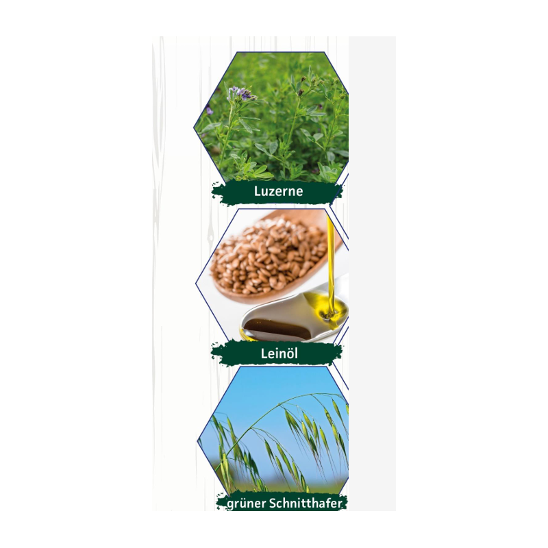 75,0 % sieczka z lucerny, 15,0 % sieczka z zielonego owsa (oba składniki suszone gorącym powietrzem), 7,0 % olej lniany, 3,0 % melasa buraczana