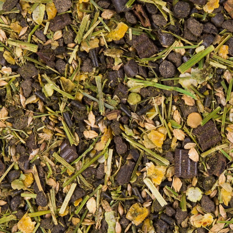Skład: lucerna, makuch lniany, poekstrakcyjna śruta słonecznikowa, płatki jęczmienne, płatki kukurydziane, łuski słonecznika, chleb świętojański, jęczmień, płatki grochu, olej słonecznikowy, soja, węglan wapnia, melasa z trzciny cukrowej, kukurydza, otręby pszenne, chlorek sodu, fosforan potasu, drożdże piwne BT, skrobia ziemniaczana